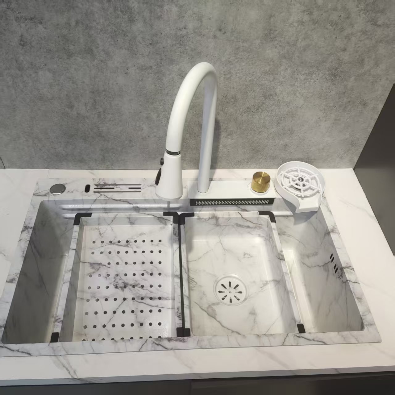| Hochbogen-Wasserhahn-Doppelbecken-Küchenspüle | 900×550×230mm | Großwinkel-Wasserauslass |